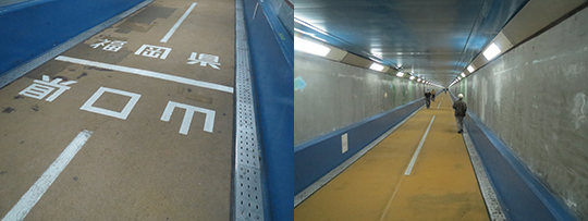 (左)人道の途中には、山口県と福岡県の県境が(右)約15分の地下道の旅