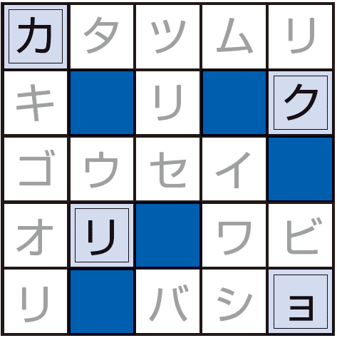 タテのカギ、ヨコのカギをヒントにマスを埋めていきます。水色の二重囲みマスに入る4文字を組み