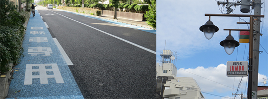 (左)2.4km続く自転車レーン(右)夜になるとLEDが商店街を照らす