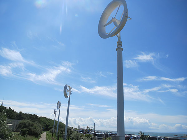 2013年7月15日、日本海が広がる市沿岸部で、青い空と青い海に映える5基の小型風力発電機が稼働を開始した。5基合わせて最大出力25kWとなるこの風車は「なぎさの白い風車」と呼ばれ、新潟市の再生可能エネルギー利用の先駆的存在となった。風車のローターには、九州大学が開発した「風レンズ」と呼ばれる特殊なダクトが取り付けられ、出力数の向上、騒音の減少などに貢献した。発電した電力は隣接する「老人憩の家なぎさ荘」へ供給され、余剰分は東北電力に売電される。今後は、新潟市の地域資源を活用した、多様な再生可能エネルギーの普及拡大のシンボルとしての役割を果たしていく。