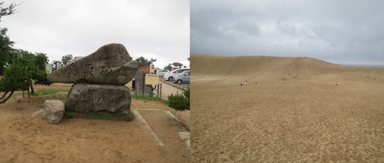 小雨降る中、鳥取砂丘へ行ってきました!やはり鳥取と言えば砂丘を思い浮かべる人が多いのではないでしょうか。鳥取砂丘は、観光可能な砂丘としては日本最大で、南北に2.4km、東西に16km広がっています。「砂丘」は「砂漠」と違い、風によって運搬された砂が堆積して作られてもの。なので、砂丘独特の植物や動物が生息しているそうです。普段中々お目にかかれない砂丘だけあって、一面に広がる光景は圧巻です。
