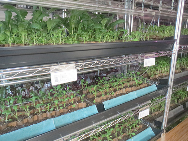 工場規模53㎡、栽培延べ面積43㎡のこの工場では、LEDを光源として、主にルッコラ、バジルなどの葉物野菜を一日100株ほど収穫している。LEDを使い、低コストで採算性の高い事業を展開することで新たな雇用につながり、また、培ったノウハウを国内外へと展開することも可能となる。工場を“まちなか”に構えることで、市民が気軽に立ち寄り、身近に感じられるだけでなく、周辺地域の活性化、ビジネスチャンスの広がりにも寄与できると考えている。