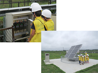 その後、屋外にある太陽光発電所へと移動。実際の太陽光パネルの前で、子どもたちは班に分かれ、巡視点検作業を行い、パネルに傷があるかなどを確かめ合った。発電所の隣では、日本で唯一の太陽光発電体験装置を使い、パネルの方角、角度を調整し、どの位置が一番発電するのか、パネルを動かしながら検証。みんなで協力し合いながら調節を繰り返し、最後に発電量が100Wを超えると、この日一番の歓声があがった。
