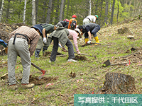 そして、千代田区と姉妹提携を結ぶ群馬県嬬恋村での活動も活発だ。2012年度から毎年春に開催している「ちよだ・つま恋の森づくり植樹ツアー」は、環境意識の高い“ひとづくり”を念頭に置いた取り組み。ツアーでは、区内在住・在勤・在学の参加者が嬬恋村を訪問し、地元の人々と交流をしながらミズナラの苗木を植樹していく。参加者が植樹体験を通して、森林保全の大切さや自然保護の意識を育むことのできる、自然の中での環境学習事業だ。区内での取り組みに留まらず、地方都市との連携を強化することで、国内全体の温暖化対策により一層の貢献を果たしていく。