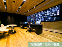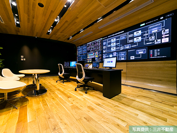 「柏の葉スマートシティ」では、「AEMS(エリアエネルギー管理システム)」により、街全体のエネルギーを一元管理。駅前中核街区「ゲートスクエア」内にある「柏の葉スマートセンター」を拠点とし、地域のエネルギー運用とともに、災害時におけるエネルギー情報を管理している。AEMSは、マンション、ゲートスクエア、「ららぽーと柏の葉」などの商業施設、太陽光発電施設や蓄電施設など、地域内の様々な施設と連携をとり、街のエネルギーの見える化、最適化を図る。災害時は、施設内の非常用発電設備を使うことで、ゲートスクエア内では通常時の6割程度の電力が供給され、3日間の維持が可能だ。