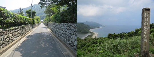 (左)石垣がならぶ「武家屋敷跡」(右)美しい「眺め」が由来の「長目の浜」