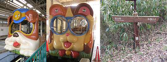 ケーブルカー「ブル」(左)と「ミケ」(中) 山頂へは徒歩でも行ける(右)