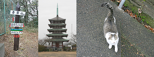 (左)香貫山山頂 (中)山腹にある五重塔 (右)猫を道連れ頂を目指す