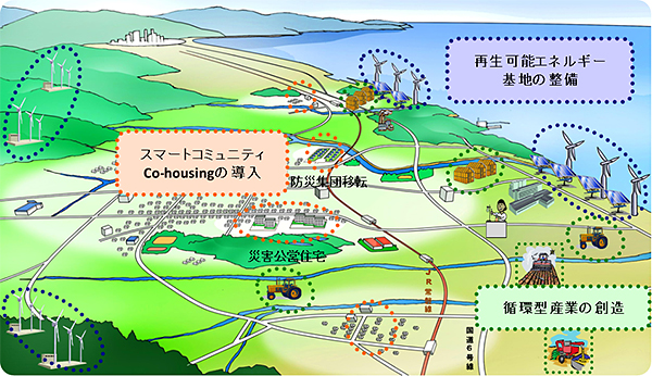 原子力発電に依存しない、持続可能で環境負荷の少ない、エネルギー確保の手段の確立を目指す「スマートシティによるエネルギー循環型都市」の構築では、2012年6月に市と東芝との間で協定が結ばれ、市沿岸部での大規模太陽光発電事業への取り組みがスタートした。計画では、東芝が主体となり、国内最大級となる100MW規模の発電所を建設。再生可能エネルギーの活用や企業誘致などにより、市の復興と地域活性化につなげたい考えだ。