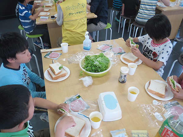 体験学習が終わると、敷地内の植物工場で採れたサラダ菜とホワイトセロリを使ったサンドイッチの昼食。ここでも地産地消のこだわりを見せた。