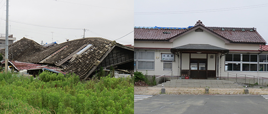 崩壊したままの家屋(左)列車を待ち続けるJR常磐線小高駅(右)