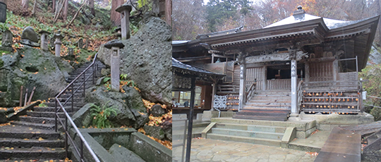 (左)1015段の階段が続く(右)30分ほどの道のりを経て、立石寺・奥之院に到着