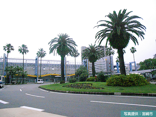 宮崎県の県庁所在地、宮崎市。年平均気温は18℃前後と温暖で、市の代表駅である宮崎駅前に植えられたヤシ類の木をはじめ、沿岸部には、夏に多くの人で賑わう青島海水浴場があるなど、南国の情緒あふれる都市である。