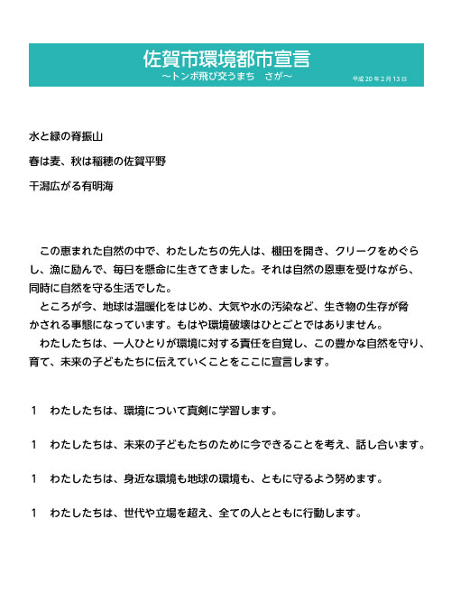 この宣言は、佐賀市の豊かな自然環境を未来の子どもたちに継承していくため、そして、市民、企業、行政等が互いに連携、協力しながら、より一層の取り組みを行っていくためのものである。