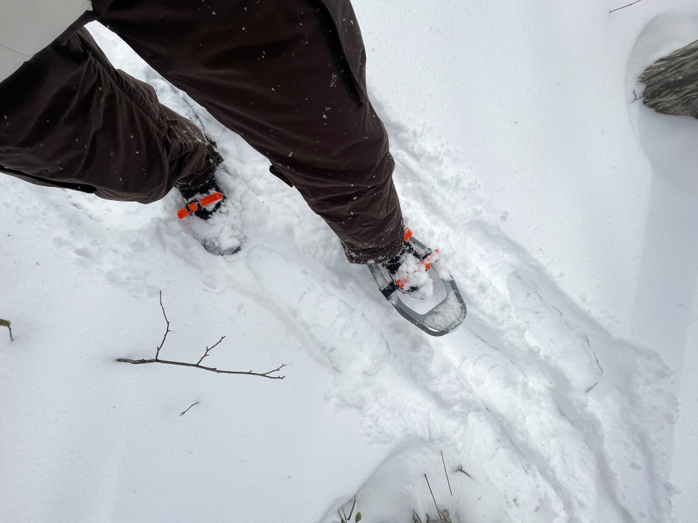 出発前は、まずスノーシューの履き方から丁寧に教えていただきます。ブーツをスノーシューにベルトで固定するのですが、周りのフレームがぱたぱたと前後に動くのに驚きました。裏面にはクランポンと呼ばれる爪が少々。新雪の上でも沈まず、ある程度の斜度があっても滑りにくい構造になっているようです。装着したまま足を持ち上げてもそこまでの重量は感じませんでした。ほほう~、これがスノーシュー。