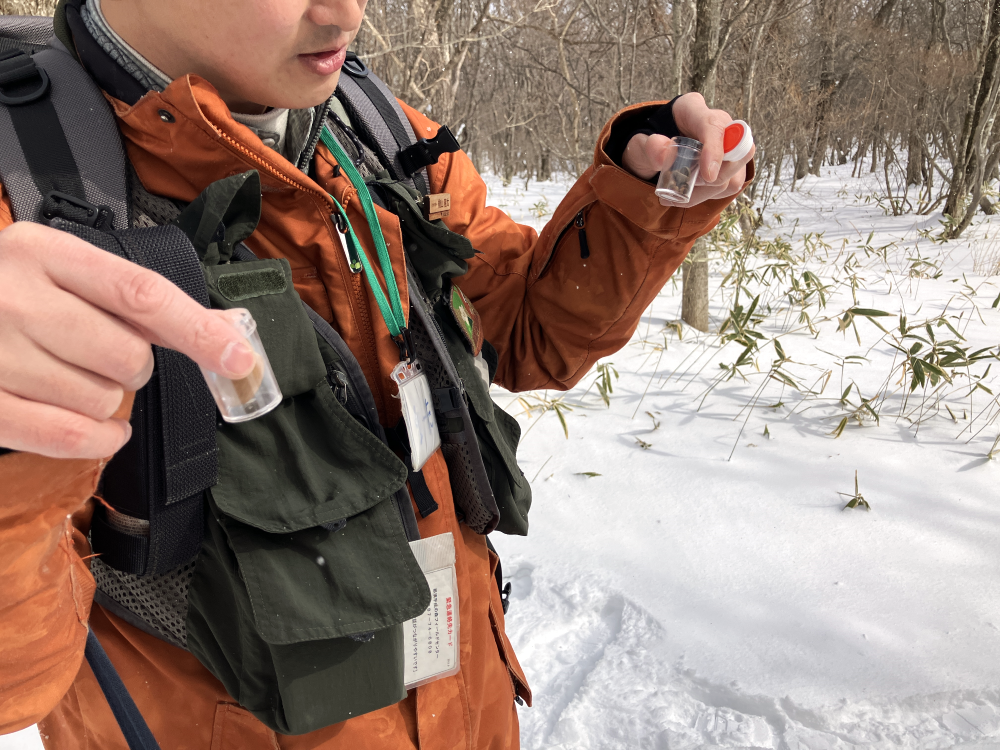 ちなみにフィールドセンター周辺は風も穏やかで少し日も差していましたが、この崖のところまで来ると気温も寒く、吹雪のような天候でした……。フィールドセンターより標高が50m程高いとのこと。実際に自分の足で移動して体感したことで、「たった50mでここまで変わるなんて!」と驚きとともに自然のすごさを如実に感じることができました。りーたさん、楽しいガイドウォークを本当にありがとうございました!