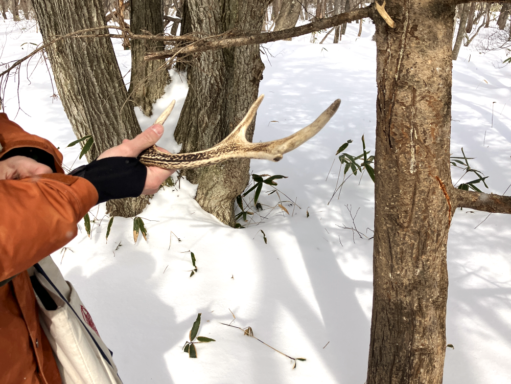 そのほか、木の幹についた鹿の角の跡や、獣道、街中で見かけるどんくりとの大きさの違いなど、道中さまざまなお話を伺いました。「そんなに色々どこから出てくるの???」と本気で不思議になるくらい、四次元ポケットのようなカバンからインタープリテーションのための道具が出てくる出てくる(笑)。