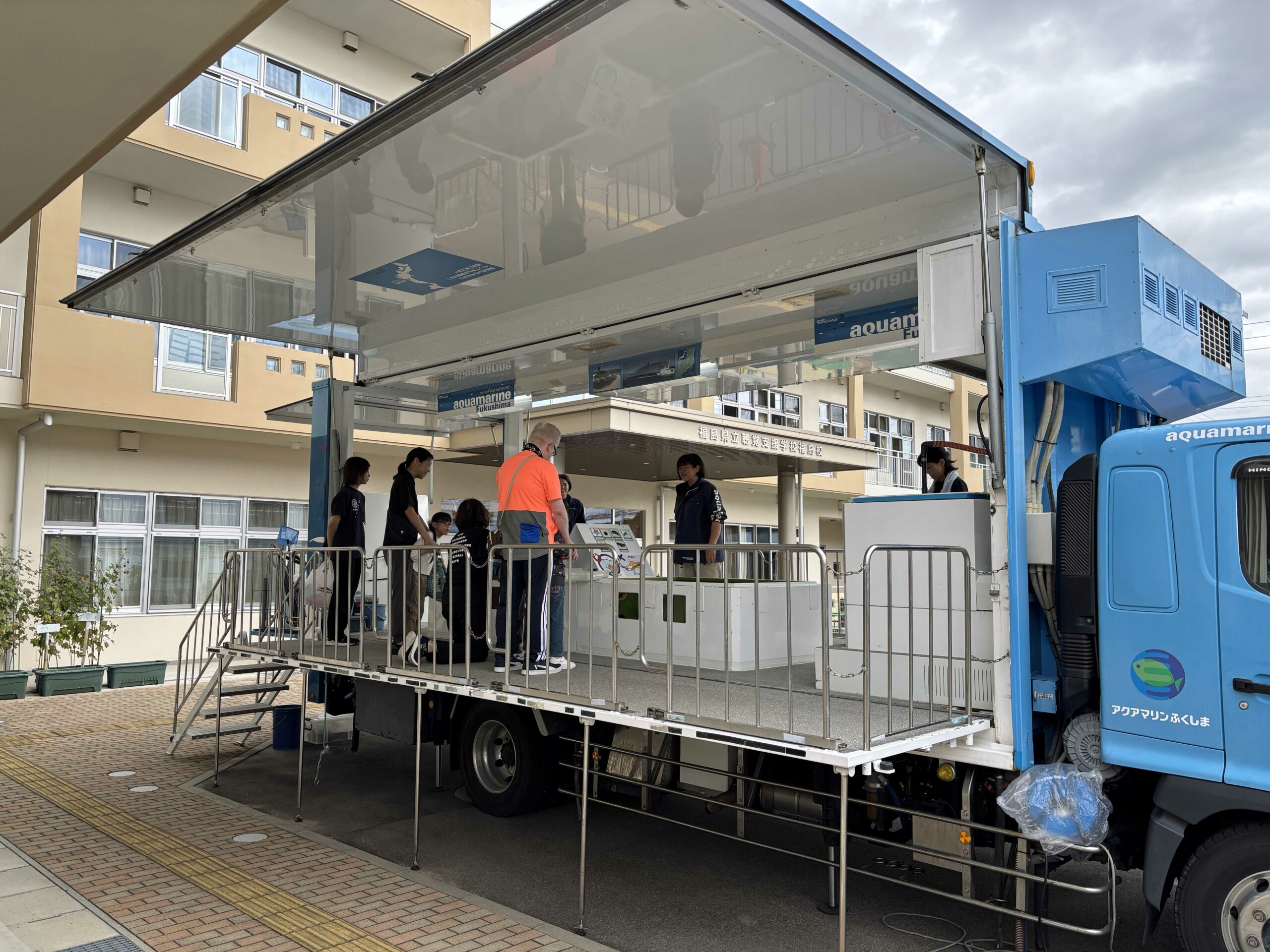 スタッフは館内での環境教育学習と併せ県内の学校などを訪問する。その1つが国内最大級の移動水族館・アクアラバン。トラックの荷台に設置した水槽にウニやヒトデ、ナマコ、カニなど海の生き物を乗せ片道3〜4時間ほどの会津や郡山、相馬などをはじめとする県内の学校を巡る。