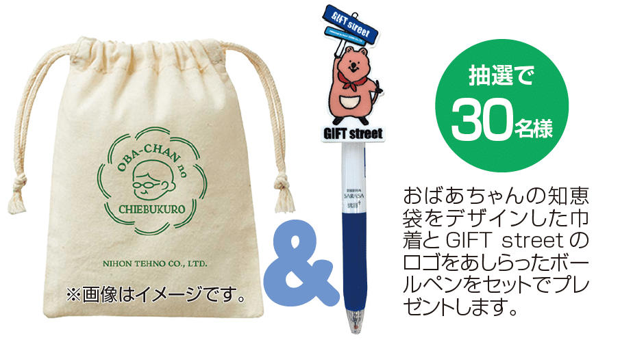 正解者の中から抽選で30名の方に日本テクノ特製「おばあちゃんの知恵袋巾着」と「GIFT street ボールペン」をセットでプレゼント!