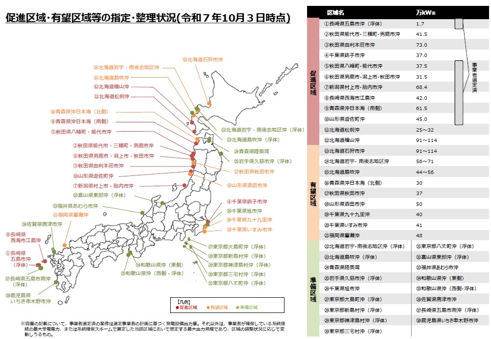 国内の洋上風力発電の促進区域・有望区域・準備区域