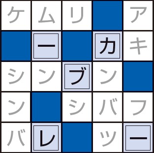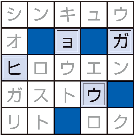 タテのカギ、ヨコのカギをヒントにマスを埋めていきます。水色の二重囲みマスに入る4文字を組み