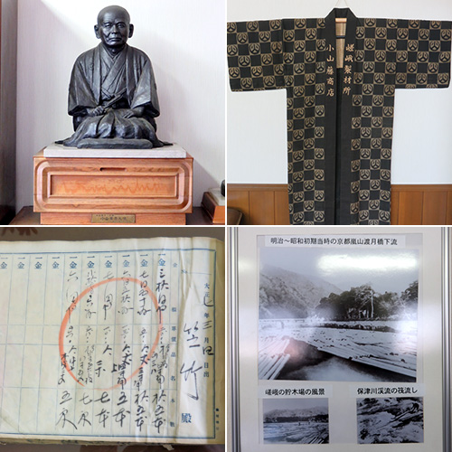 命の危険を感じて逃げ込んだ応接室には、顧問の祖父の銅像や古い半被があった。京都の材木屋で日本の製材業の父と呼ばれた方と聞いた。京都嵐山の渡月橋付近に材木が集まっている古い写真や大正時代の帳簿なども見せていただいた。四人の息子をこれからは大阪で商売をしろと、独立をさせ、大阪の材木業界を引っ張ってきた。「同じ木材はないから、一本一本を見極め大切に加工していく」と木に対しての深い愛情を感じる言葉と、古いものを大切にしながらも、新しいことに挑戦し続ける小山顧問が力強さとすべてを守る優しさを持つ大樹に見えた取材でした。