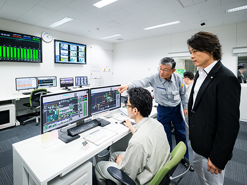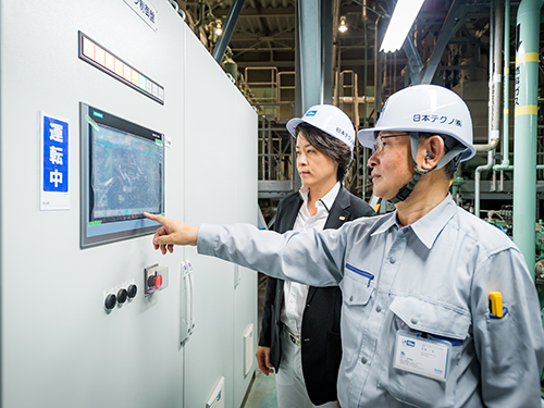 発電所を訪れた河村さんの印象に強く残ったのは「施設の清潔さ」だった。まるで半導体工場のクリーンルーム。所員の執務スペースは建物の中央にあり、左右に各7基のガスエンジン発電機(1基7800キロワット、合計約11万キロワット)を挟む場所。このエリアは土足厳禁で、来所者も室内履きに替えて入室する。清潔を保つよう規制を受けているわけではない。環境配慮の姿勢が、身の回りのことにも自然と及んだだけだ。河村さんは、そこに「環境への思い」を感じ取った。普段から植樹運動への寄付など環境活動に関心を寄せているだけに、発電所の運営姿勢に共感を持ち、強い印象として残った。