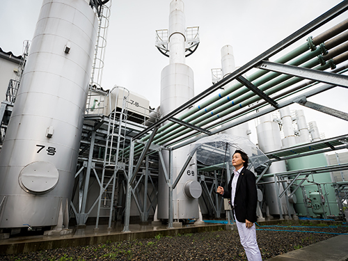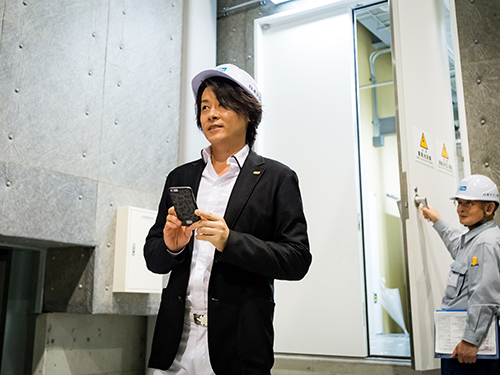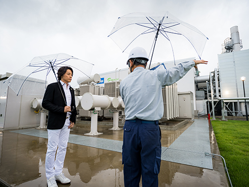 日本テクノのイメージキャラクターである河村隆一さんが、天然ガスエンジン発電所「日本テクノ上越グリーンパワー」を訪問した。当日はあいにくの雨。だが、河村さんと施設スタッフの環境への思いは、雨粒をはじき返すほど力強かった。