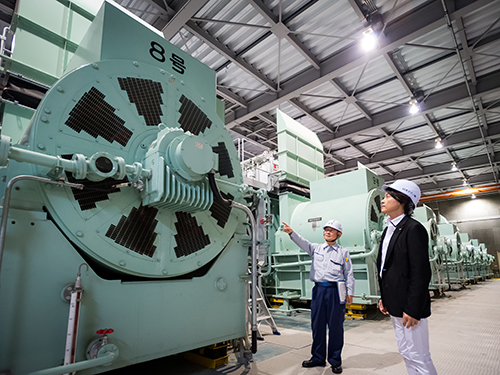 安全のためヘルメットを着用し、エンジンの稼働音に備え耳栓をして、発電機棟へ。エンジンの熱で室内は50℃にもなる。轟音により互いの声は聞こえない。それでも事前に説明した箇所を身振りで指し示す。声は届かなくても、石井所長の誠実さと河村さんの熱意ですべてを理解し合えているようだ。発電棟内を出る直前、今回の体験をより鮮明に残そうとスマートフォンで撮影を行う河村さんの姿が印象的だった。