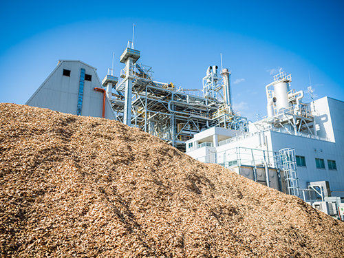 化石燃料を除き、動植物から生み出された生物資源を総称してバイオマスという。ここで使用する木質チップもその一種だ。バイオマスは半永久的に自然から与えられる太陽光や風力と同様の再生可能エネルギーと定義されている。木質チップを燃焼すれば二酸化炭素(CO2)が発生するが、それは植物の成長過程で光合成により吸収したもので大気中のCO2 はトータルで見れば変わらない。これを「カーボンニュートラル」といい、燃料の100%をバイオマスで賄うことで、この発電所はそれを実現している。