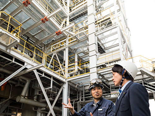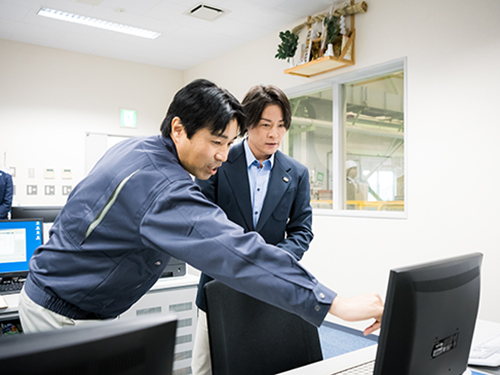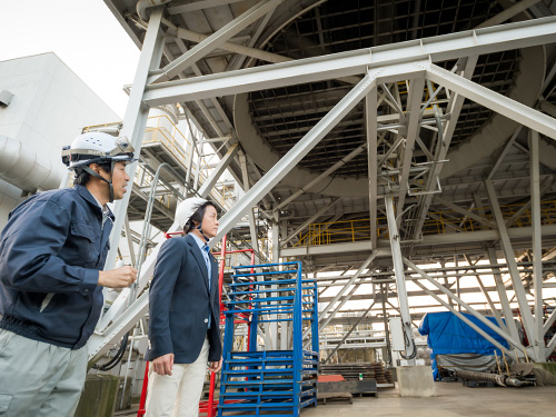 まずバイオマス発電の仕組みを理解するため屋内へと案内された河村さん。所長の笹山久さんが「利用されていない間伐材などを使って木質チップがつくられます」と説明すると、「では、林業の活性化や荒れてしまった森林の再生にも役立ちますね」と河村さんが笑顔を向ける。その後、中央操作室でオペレーション業務を見学し、蒸気タービンと発電機を間近に見ながら説明を受ける。