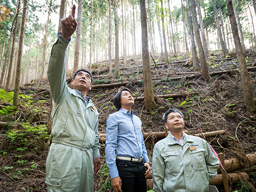 土砂災害を防ぐ、雨水を吸収し水源を確保する、二酸化炭素(CO2)を吸収する、多様な生物種の生息地になる・・・森林が果たす機能は人間にとってなくてはならないものだ。それが木材価格の低迷で林業が衰退し、適切な管理がなされないまま、荒廃が進んでいる。混み合った状態の木立は間引いて適正な間隔をつくらないと、林床に日光がささなくなり下草も生えず、森林は本来の機能を果たせない。間伐作業が済み、明るくなった森を見た河村さんが「光の届き方が違いますね」と感心する。