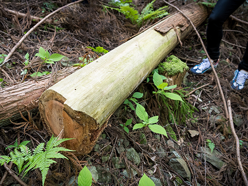 途中にはクマに皮を剝がれた木もあった。樹液をなめた跡だという。取材に同行したスタッフはみんな息を切らしている。そうして到着した作業後の現場は、木々の間から青空も見える明るい森だった。下草の緑も映えている。行き着くだけでも難渋する場所で行われていた間伐作業の苦労に心を打たれた。