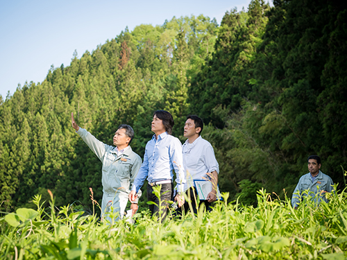 最初は組合の本所に集合。職員の皆さんが河村さんをあたたかく歓迎する。そこから自動車で20分ほど移動し、間伐作業後間もない森へ。副組合長の有馬嘉太郎さんと参事の吉田昭雄さんが案内役を務めてくれた。山道の入口で車を降り、勾配のきつい斜面を登る。