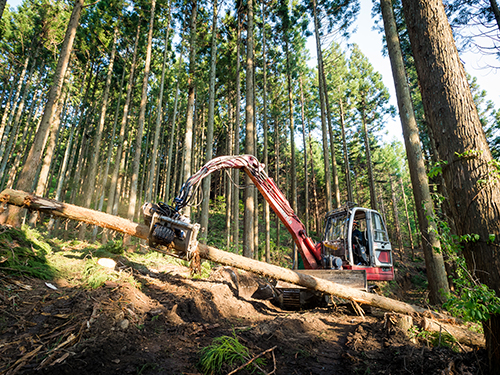伐採した木は、周りの枝を落とし、一定の長さに切り揃えた丸太にします。昔はその作業もチェーンソーを使って人の手でやっていたそうです。でも今はこの専用重機が一連の作業をしてくれます。アームで木をつかんで操作すれば、自動的に丸太を滑らせながら枝落としや切断ができる。間近で見るとすごい迫力でした。