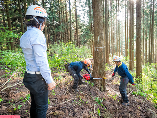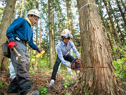 次に向かったのは、実際の作業現場。伐採や重機を使う丸太の切り出し作業が4人1組のチームで進められていた。河村さんもチェーンソーを使って作業を体験させてもらう。まず倒す方向に三角形の切り込みをつけてもらい、逆側から切り込みの手前まで刃を入れる。その後はくさびを打ち込みながら緩やかに倒す。無駄のない連携した動きに熟練の技術を感じる。そして作業チーム全員の表情がとても明るい。森を守る仕事に誇りを持っている証だろう。