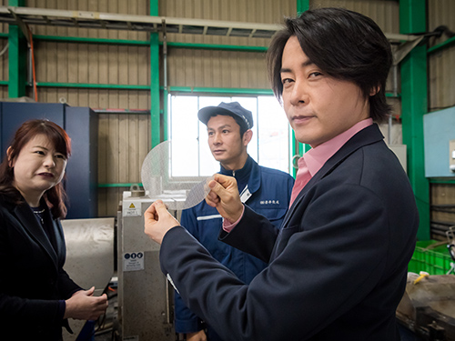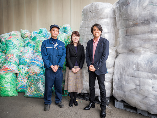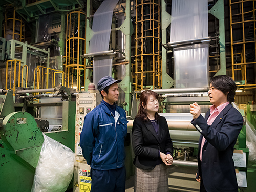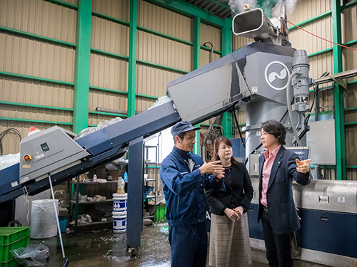 最初に事業内容の説明を受け、常務取締役の鈴木泰代さんとリサイクル事業部長の山本英門さんの案内を受けつつ、廃プラのストック場所へ。河村さんが「これがもう一度生まれ変わるんですね」と積まれた「資源」にやさしい視線を向けた。次はプラントのある工場内へ。ここで廃プラを熱処理し、成形の原料となるペレットにする。コンベアに投入する廃プラは種類によって分量を調整する。その配合で、最終製品の品質が左右される。さじ加減は経験による判断だ。