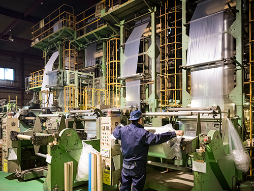 プラントの向かいの棟にあるインフレーション成形工場内。ペレットになった再生原料は、ここで再び熱を加えてシート状に成形されます。機械から出てくるときは、まるで風船を細長く膨らませたような形。それをローラーに通して平たくすれば、袋のもとになる2枚重ねの状態に。ここでは月に最大300トン処理できるそうです。