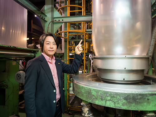 そして最終工程の製袋。ロールに巻かれたシート状の仕掛かり品を裁断や折り加工して製品に仕上げる。廃プラの受け入れから製品化まで一連の工程が、1社の中で完結していた。それが「廃材だったモノを社会の輪の中に戻す」という理想的なつながりを生み出す秘訣のように思えた。