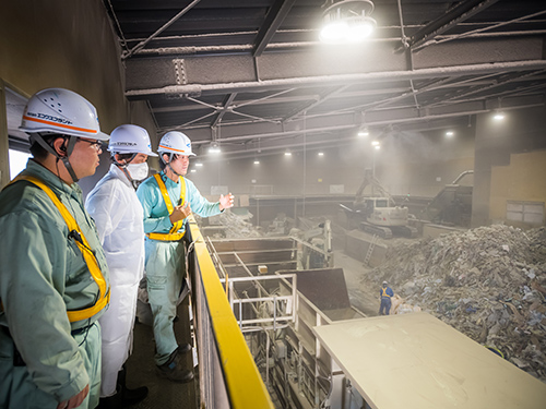 外階段から上がって工場内部を上から見渡せるキャットウォークに入る。十数人のスタッフのきめ細かい作業と、それを助ける重機の動きが一望できた。河村さんが思わず「すごい」と感嘆する。場内に下り、廃棄物がコンベアで流れる選別ラインに行くと、ここでも人と機械による分別作業がなされていた。