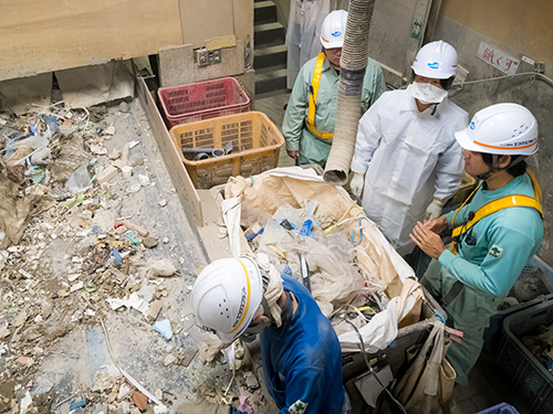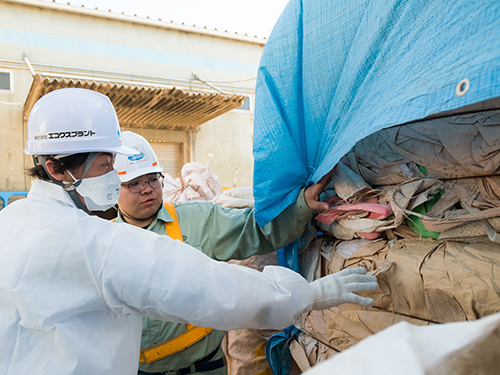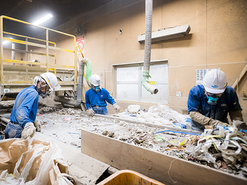 扱うのは主に建設廃棄物。処理するものの9割以上は建てるときに排出される廃プラスチック類や木・紙・金属くず、がれき類といった新築系廃棄物だ。1日500トンは処理できる工場規模。それを100トン程度に抑えているのは、地球温暖化防止のため少しでも再資源化率を高め、埋立処分場へ〝捨て〞てしまうものを減らしたいから。手間や時間をかけず、分別できないものとして埋め立てに回せば、人件費など運営コストは抑えられる。その方法を選択しない経営方針が、最高水準の再資源化率を生む。「それが皆さんの誇りにつながり、企業の信頼性も高めているんでしょうね」と河村さんが感心する。