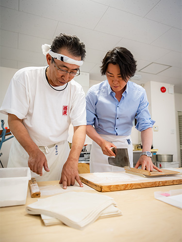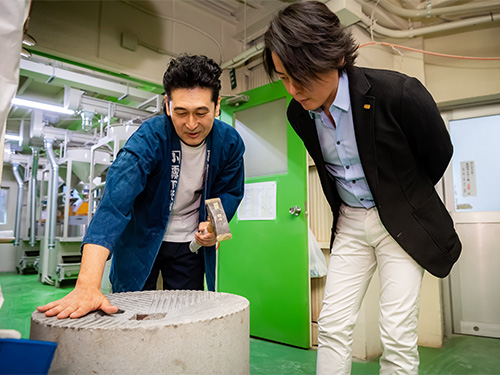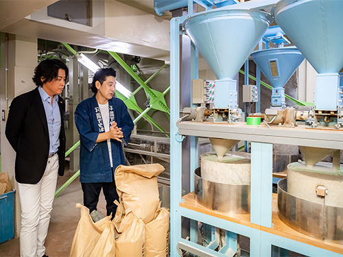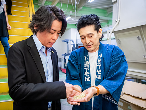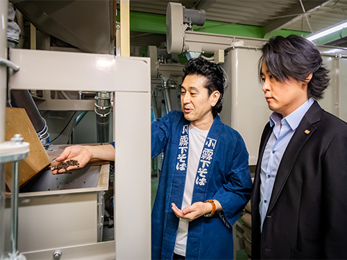 そば粉製造は石臼でひくだけではなく、精選、脱皮、ミキシングなど複数の緻密な工程が必要になる。河村さんはその一連の流れを見学し商品一つひとつに込められた強いこだわりを感じ取っていた。
