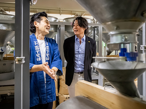 そばの実をひく石臼が約60台。石はそれぞれの材質や目立てが異なり、求める味や香りなどに応じて選別するのはもちろん、回転数や材料供給量といった細かな調整も怠れない。約250年続くそば粉製造の「霧下そば本家」。この老舗の提供する商品が第1回ベストギフトに選出された。「米粒ほどのそばの実を色や大きさで選別したり、シルクを使いふるいにかけたり、作業はとても繊細。いいものをつくるため日々試行錯誤する姿勢はまさに職人ですね」と製造現場を案内された河村隆一さんが感嘆する。